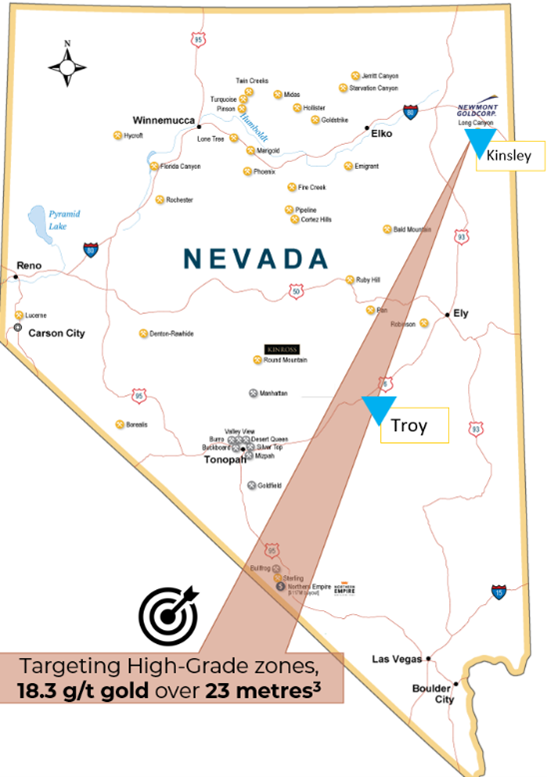 Kinsley is a past-producing open pit oxide gold mine that yielded approximately 138,000 ounces of gold between 1995 and 1999, when gold prices averaged around US$360 per ounce. Operations ceased when the former operator, Alta Gold, shifted focus to another project and later entered bankruptcy, leaving Kinsley idle despite its strong exploration potential.